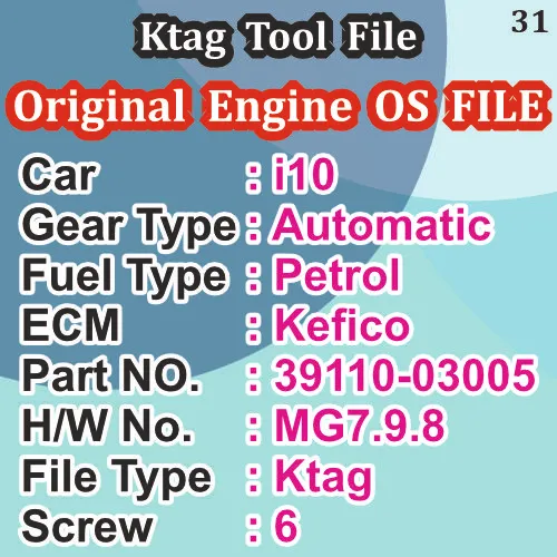 i10 Petrol Automatic Gear Original Engine OS File-MG7.9.8-39110-03005-Using Ktag-6 Screw