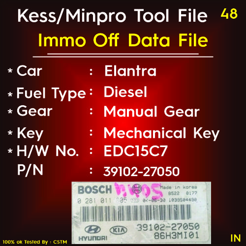 Immo off File Elantra Diesel Manual Transmission Mechanical Key Start 0281011805 Part No 39102-27050 H/W EDC15C7 Kess/Minpro tools file Bosch Ecm 86H3MI01